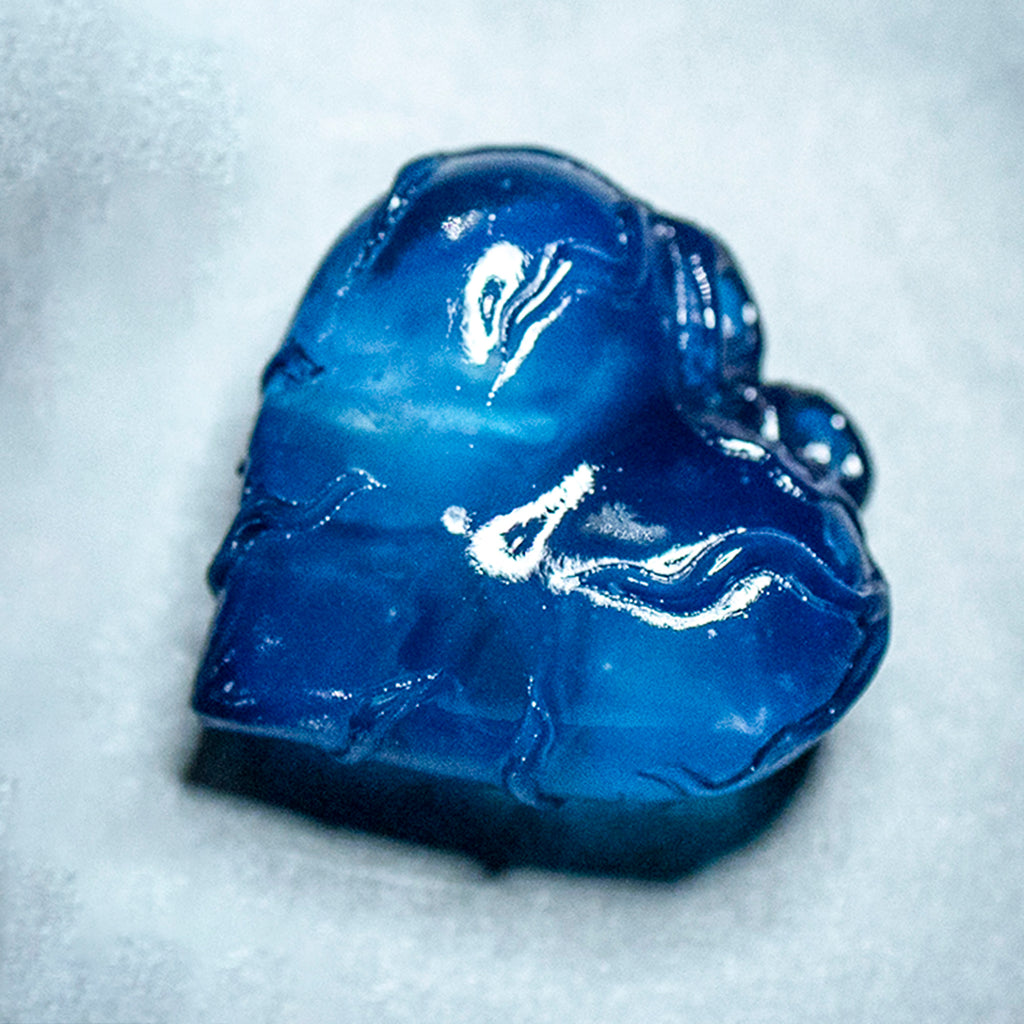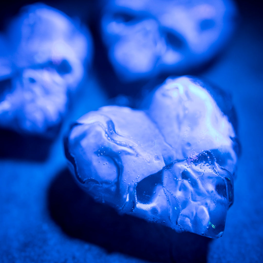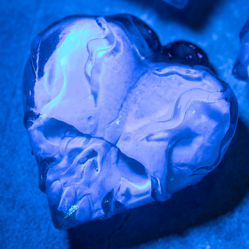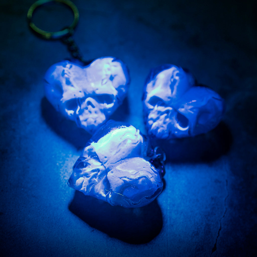 The heart is clear blue, but when lit up with a black (UV) light, a glowing blue skull will appear! The Ghost Heart is available with a loop for use as a pendant, with a keychain ring, or as just the heart.